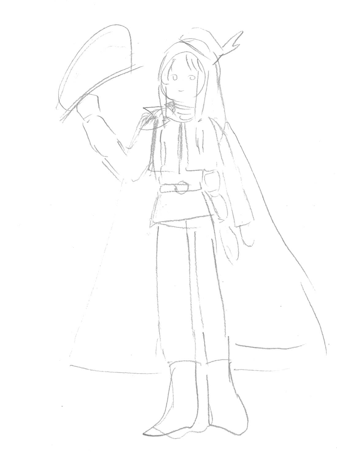 ラクガキですみませんが、ソレル旅装束。右手に持っているのは弓のつもり・・・。